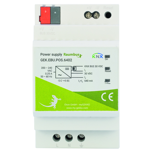Das KNX Netzteil ist eine 640mA-Stromversorgung. Dieses Gerät enthält eine KNX-Busdrossel und einen zusätzlichen Ausgang für die Stromversorgung.