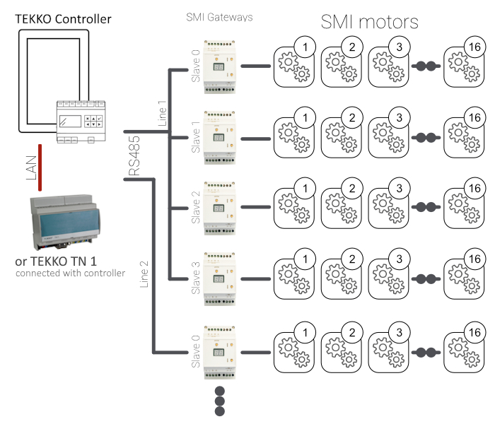 Die Kommunikation des TEKKO OS mit SMI erfolgt über ein SMI Gateway, welches über eine RS485 Schnittstelle am Controller oder einem TEKKO TN 1 angeschlossen wird. Am SMI Gateway werden alle Motoren über eine 5-adrige Leitung angeschlossen.