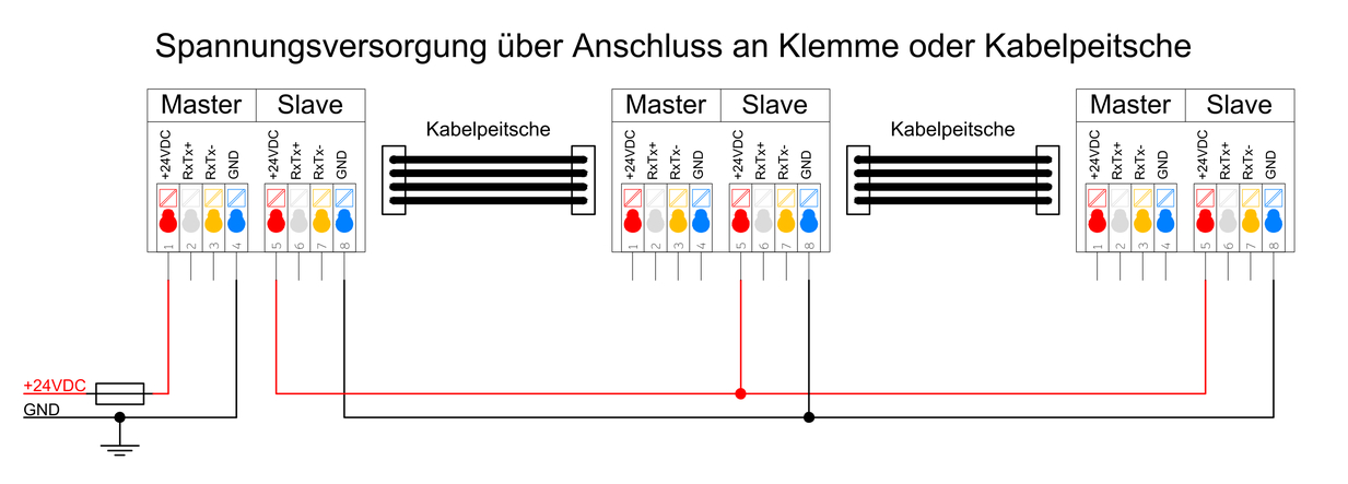 Beachten Sie, dass die Einspeisung der Module mit 3A abgesichert werden muss. Übersteigt der Stromverbrauch die 3A müssen die Module separat eingespeist werden. Achten Sie dazu auf die Stromaufnahmen der Module.