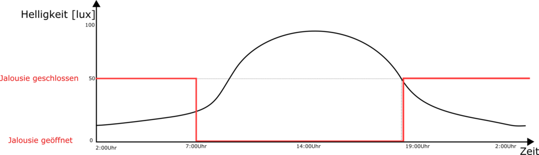 Bei unserem Beispiel, schließt die Jalousie abends, wenn die Helligkeit 50lux unterschritten wird. (Jalousie dämmerungsabhängig schalten)